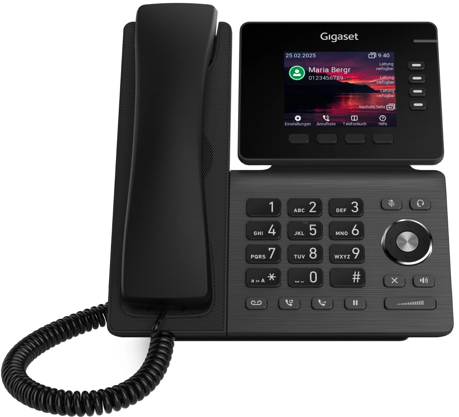 Das Gigaset DESK 600 verfügt über ein dreizeiliges LC-Display mit LED-Hintergrundbeleuchtung, das Rufnummer, Name,Gesprächszeit und VIP-Status (sofern zugeteilt) des Anrufers anzeigt. Der Startbildschirm informiert zudem über das Datum, die Uhrzeit und den Wochentag.