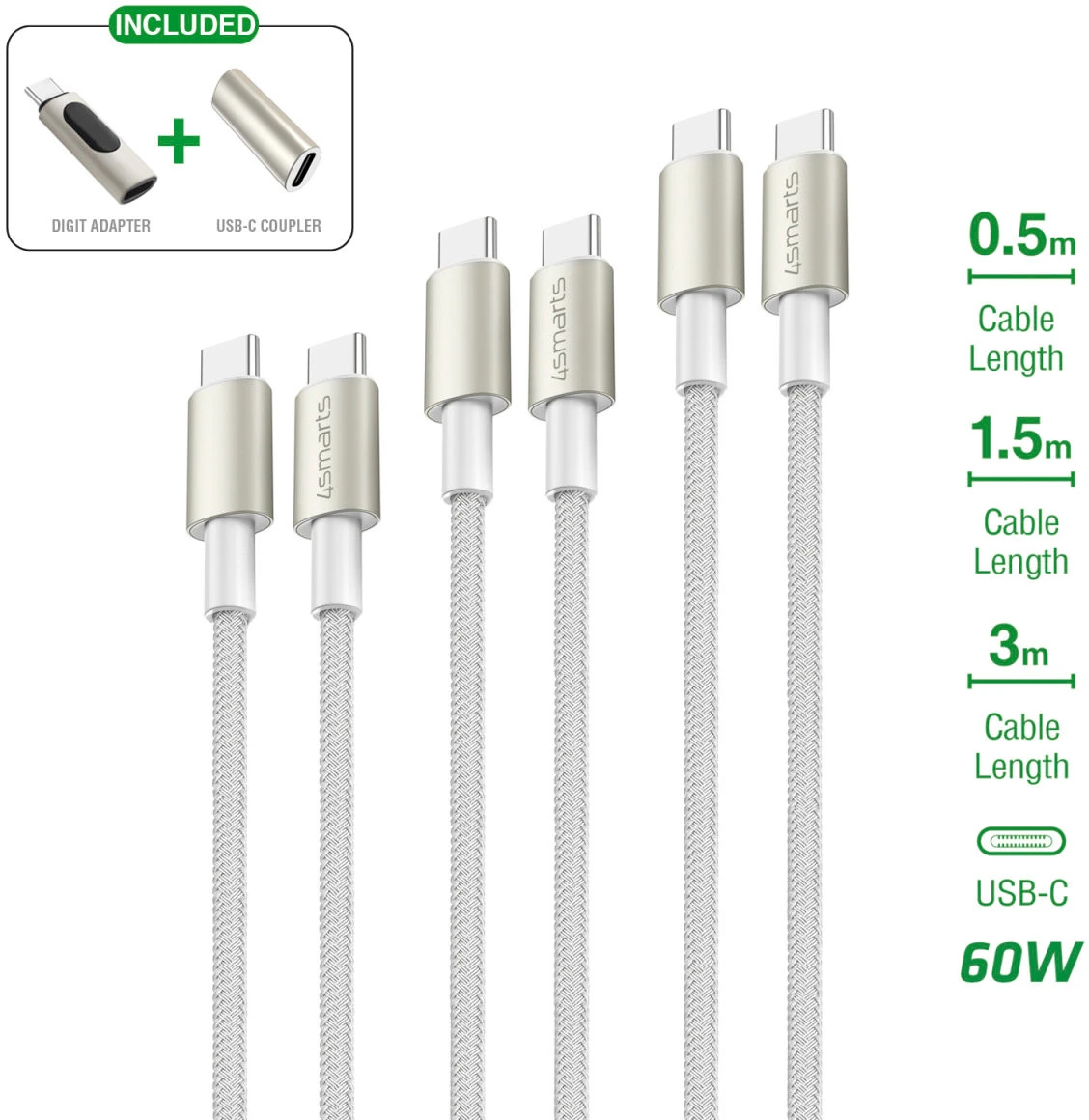 4Smarts USB-C Kabelset PremiumCord 60W inkl. Digit Adapter u. Koppler Weiß